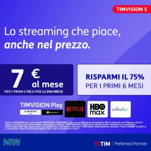 TIM WiFi Casa e TV SFibra fino a 2,5 Gbps con Modem TIM incluso.Internet veloce e chiamate illimitate.Attivazione fibra inclusa a rate.TIMVISION Play con Netflix (con pubblicità), HBO Max (con pubblicità) e Infinity+.A soli €29,90! Affrettati! Scopri di più